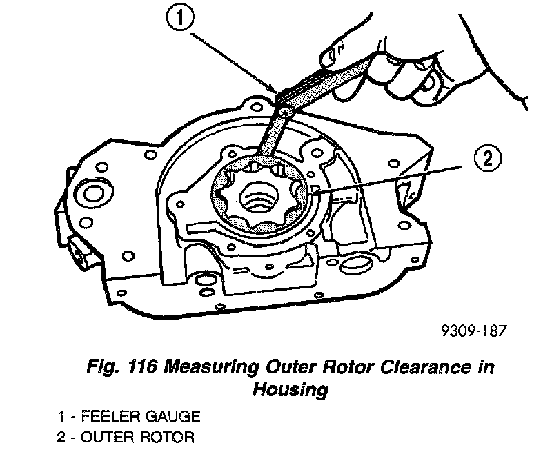 4. Slide outer rotor into body, press to one side with fingers and measure clearance between rotor and body (Fig. 116). If measurement is 0.39 mm (0.015 inch) or more, replace body only if outer rotor is in specifications.