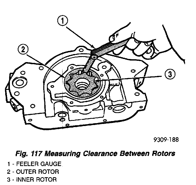 5. Install inner rotor into body. If clearance between inner and outer rotors (Fig. 117) is 0.20 mm (0.008 inch) or more, replace both rotors.