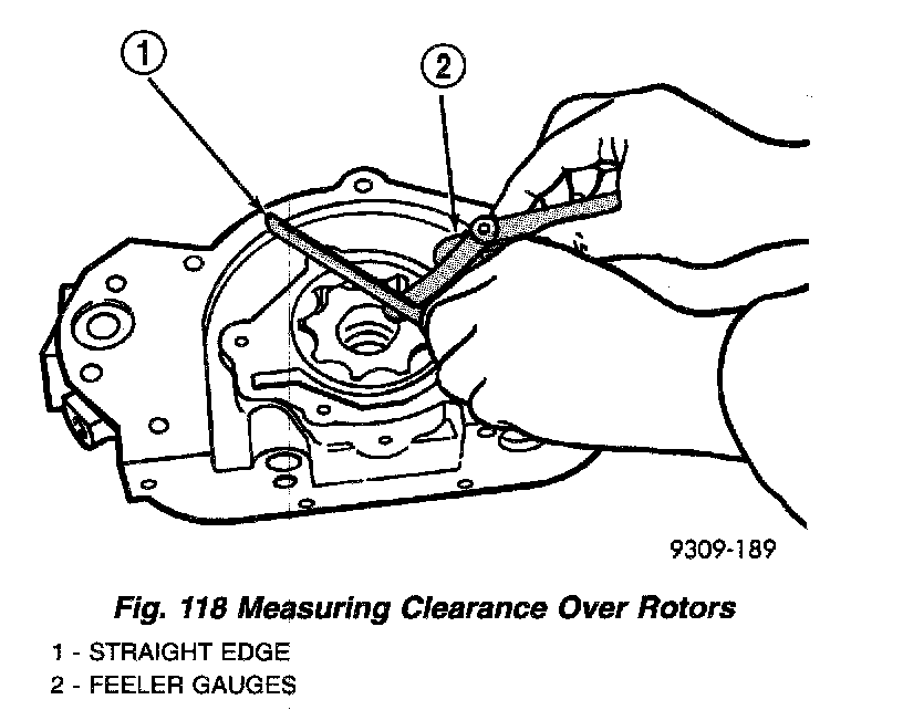 6. Place a straightedge across the face of the body, between bolt holes. If a feeler gauge of 0.077 mm (0.003 inch) or more can be inserted between rotors and the straightedge, replace pump assembly (Fig. 118) ONLY if rotors are in specifications.