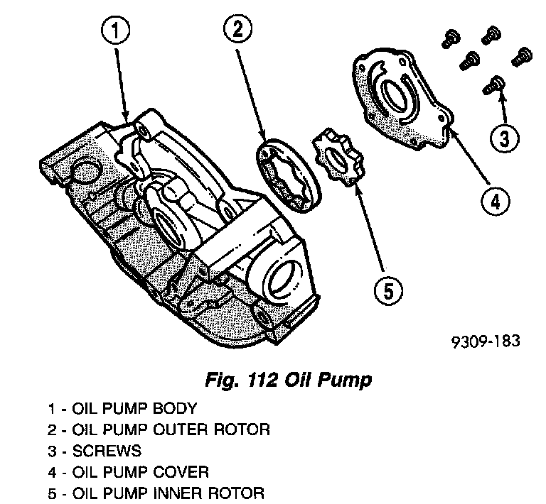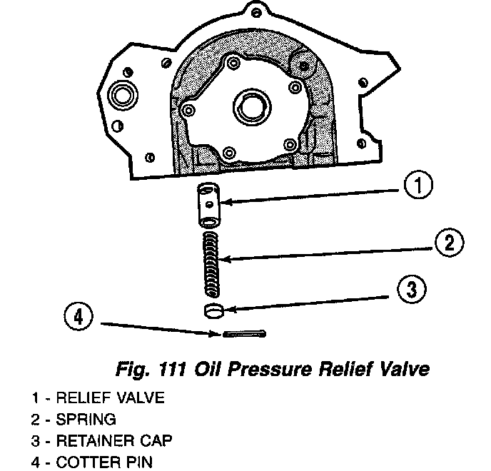 3. Clamp screw into a vise and while supporting oil pump body, remove cap by tapping oil pump body using a soft hammer. Discard retainer cap and remove spring and relief valve (Fig. 111).