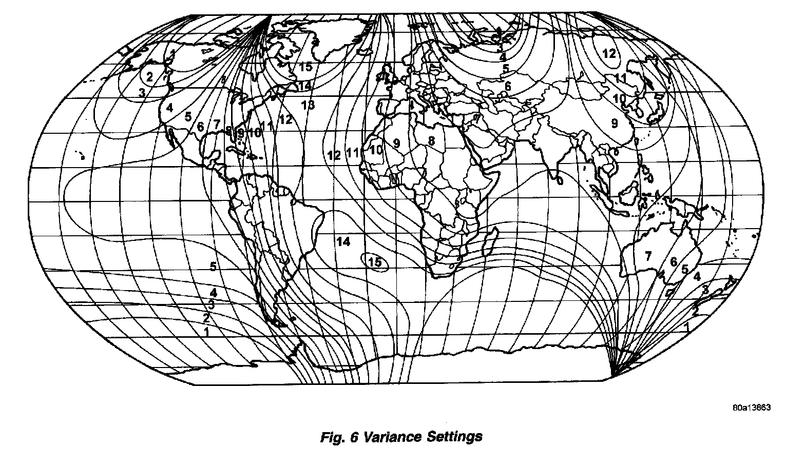 Variance is the difference between magnetic north and geographic north. To adjust the compass variance, set the EMTM to Compass/Temperature mode and press the center button for five seconds. The symbol VAR and the current variance zone number Will be displayed. Press the step button (center button) to select the proper variance zone as shown in (Fig. 6). Once the proper zone has been selected, wait three seconds and the display will return to normal operation. If the center button is held for 10 seconds instead of 5 seconds, the EMTM will set the variance to 8 and enter the fast calibration mode.