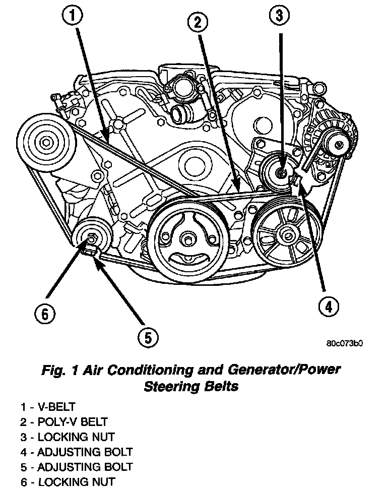 4. Loosen tensioner adjusting bolt until the belt can be removed (Fig. 1).