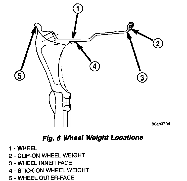 This vehicle is equipped with wheels that do not have a flange on the outer face. For this reason clip-on wheel weights can not be used on the outer face of the wheel but can be used on the inner face. When balancing the wheels, stick on weights must be used in place of the clip-on weights on the outer face on the wheel. The stick on weights must be located on the wheel as indicated in.