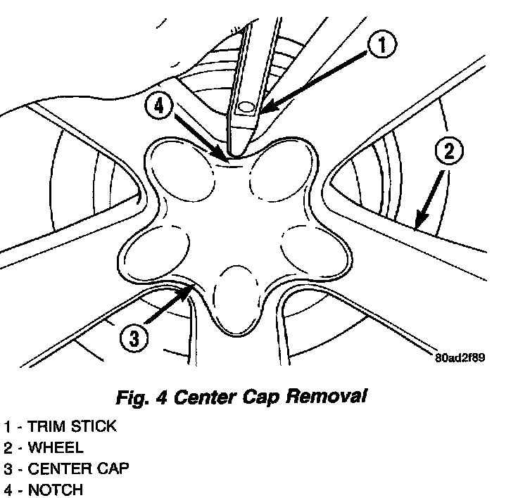 2. Remove the center cap from the wheel. The center cap is removed by inserting a trim stick into the notch on the center cap and prying it off the wheel.
