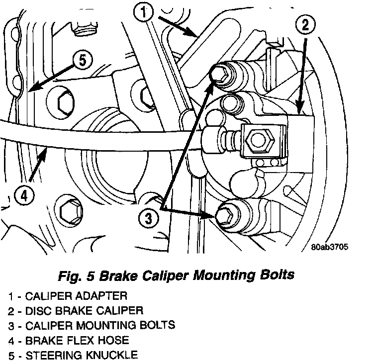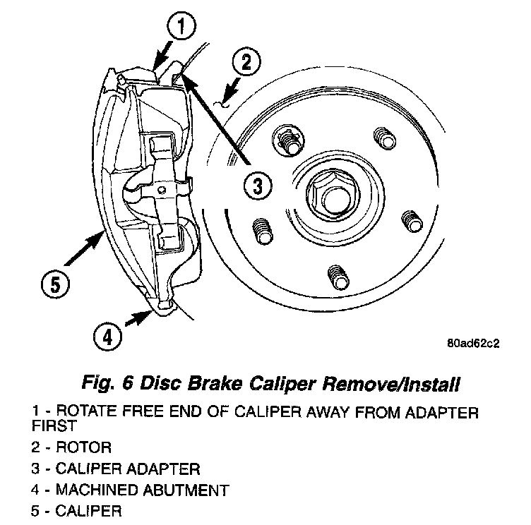 5. Remove the disc brake caliper from the caliper adapter. The caliper is removed by first rotating the free end of the caliper away from the caliper adapter. Then with the free end of the caliper rotated away from the adapter, lift the caliper off the machined abutment on the adapter.
