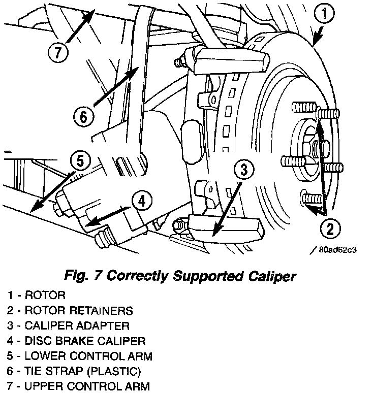 6. Support the disc brake caliper firmly by hanging it from the upper control arm using a tie strap. Do not let the flex hose support the weight of the brake caliper, damage to the flex hose can occur.