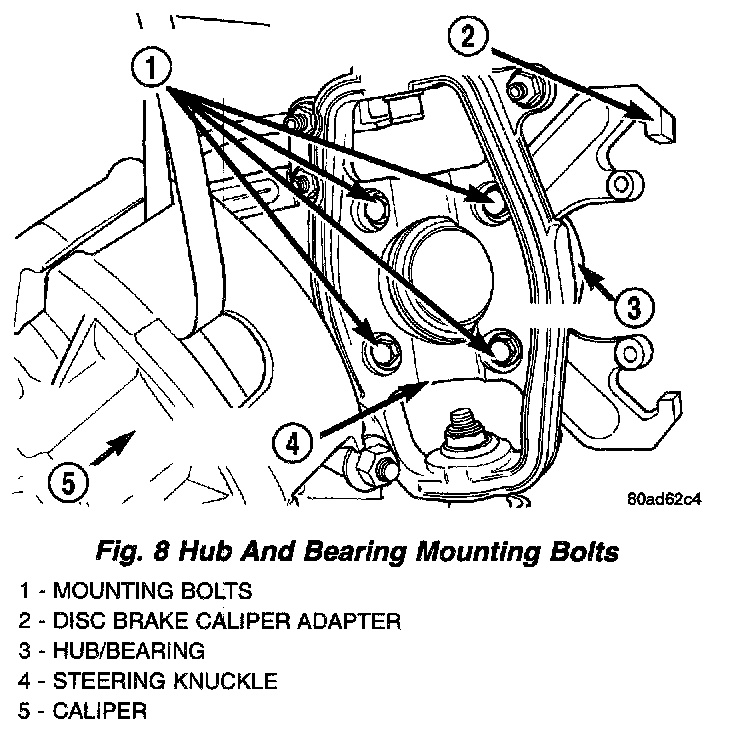 8. Remove the 4 bolts mounting the hub and bearing and the caliper adapter to the steering knuckle.