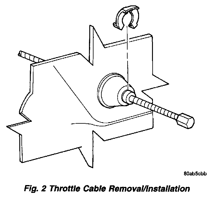 3. Remove retainer clip from throttle cable and grommet at dash panel (Fig. 2).
