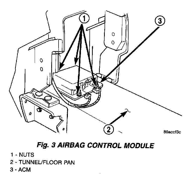 2. Position ACM (arrow pointing forward) in the console floor bracket, attach the four nuts and tighten to 11 to 14 Nm (105 to 125 in. lbs.) torque.