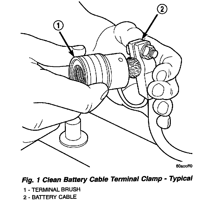 1. Clean the battery cable terminal clamps of all corrosion. Remove any corrosion using a wire brush or a post and terminal cleaning tool, and a sodium bicarbonate (baking soda) and warm water cleaning solution (Fig. 1).