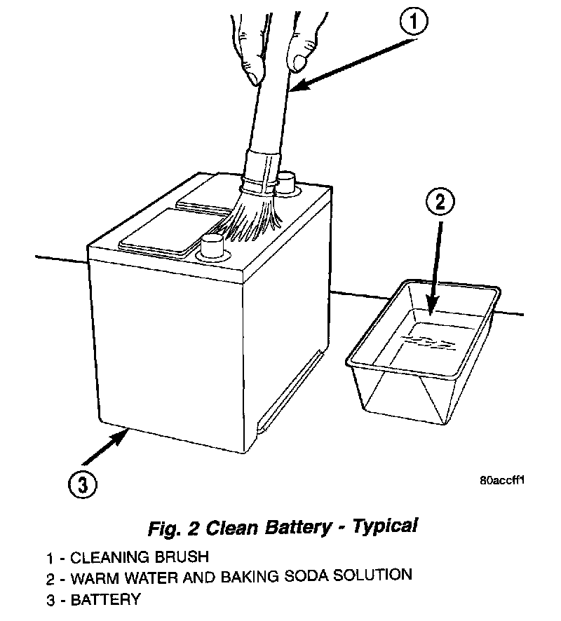3. If the removed battery is to be reinstalled, clean the outside of the battery case and the top cover with a sodium bicarbonate (baking soda) and warm water cleaning solution using a stiff bristle parts cleaning brush to remove any acid film (Fig. 2). Rinse the battery with clean water. Ensure that the cleaning solution does not enter the battery cells through the vent holes. If the battery is being replaced, refer to Battery Specifications for the factory-installed battery specifications. Confirm that the replacement battery is the correct size and has the correct ratings for the vehicle.