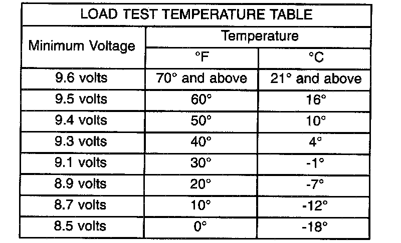 6. The voltage drop will vary with the battery temperature at the time of the load test. The battery temperature can be estimated by using the ambient temperature during the past several hours. If the battery has been charged, boosted, or loaded a few minutes prior to the test, the battery will be somewhat warmer. See the Load Test Temperature Table for the proper loaded voltage reading.