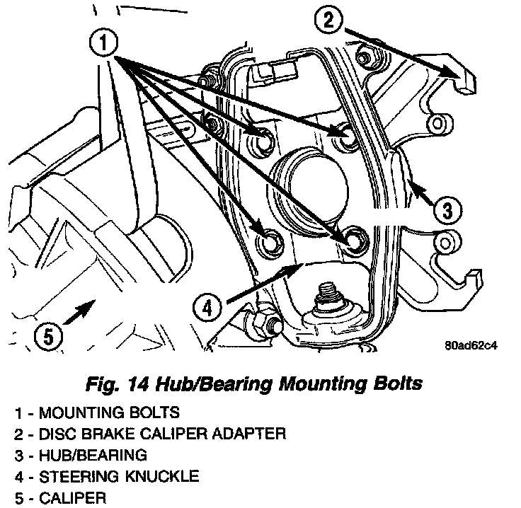 8. Remove the 4 bolts mounting the hub and bearing, and the caliper adapter to the steering knuckle, then remove those components.