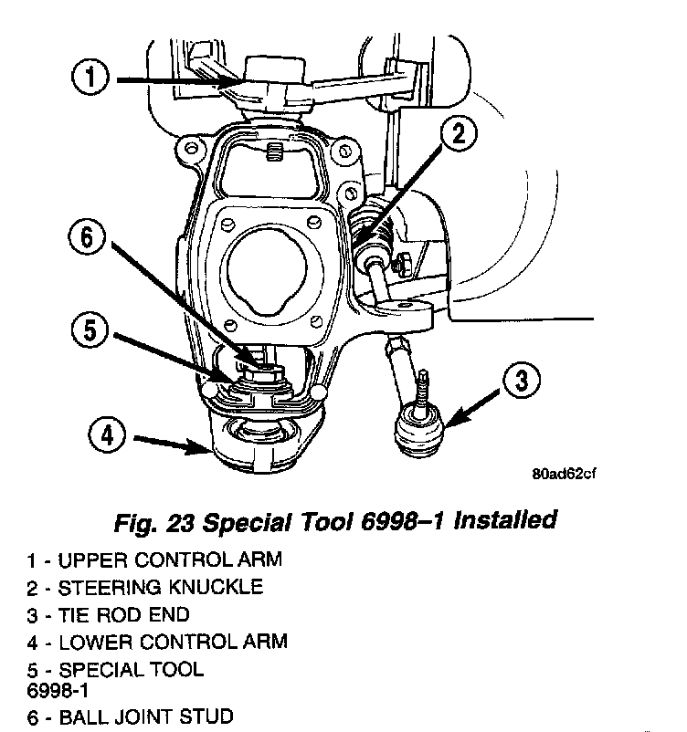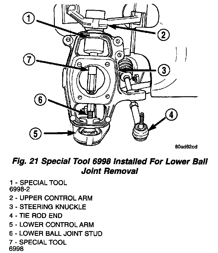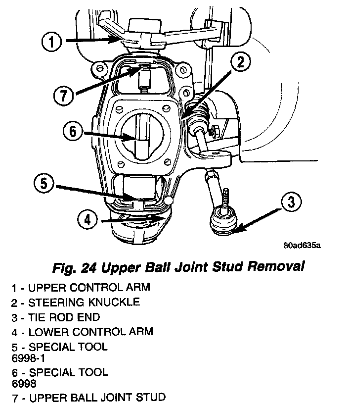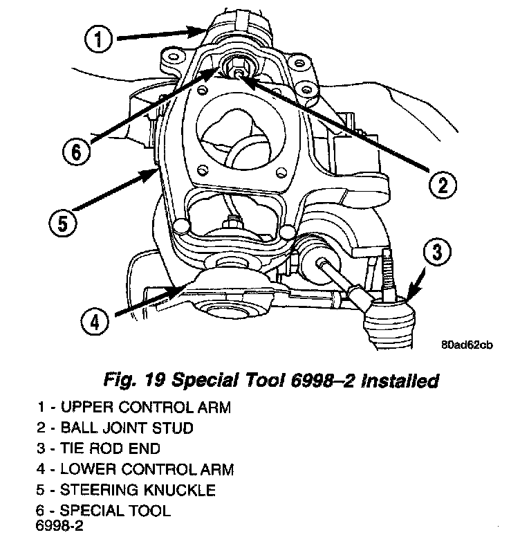 19. Install Remover, Special Tool 6998, between Special Tool 6998-1 and the upper ball joint stud.
