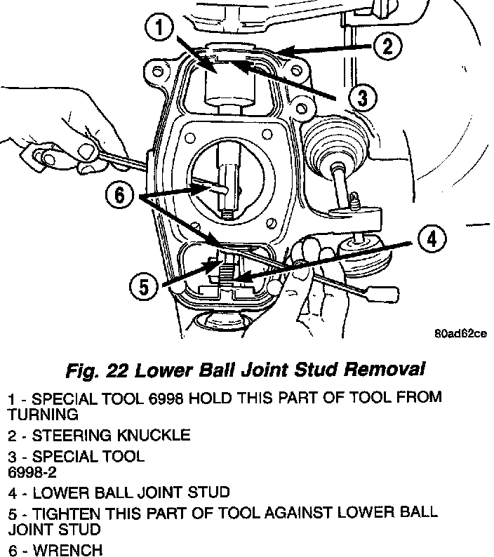16. To release the lower ball joint form the knuckle, first place a wrench on the portion of Special Tool 6998 that is against Special Tool 6998-2 to keep it from rotating. Using another wrench, tighten the threaded end of Remover against the stud of the lower ball joint. This will press the lower ball joint stud out of the steering knuckle. After released from the knuckle, do not completely remove the ball joint stud from the knuckle.