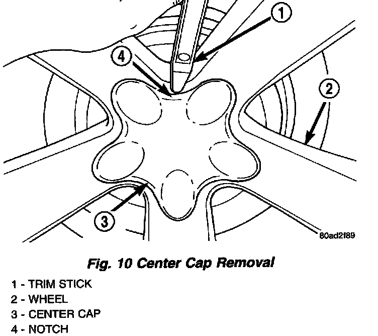 2. Remove the center cap from the wheel. The center cap is removed by inserting a trim stick into the notch on the center cap and prying it off the wheel.