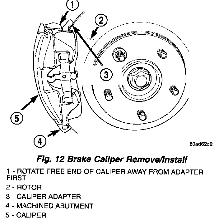 5. Remove the disc brake caliper from the caliper adapter. The caliper is removed by first rotating the free end of the caliper away from the caliper adapter. Then, with the free end of the caliper rotated away from the adapter, lift the caliper off the machined abutment on the adapter.