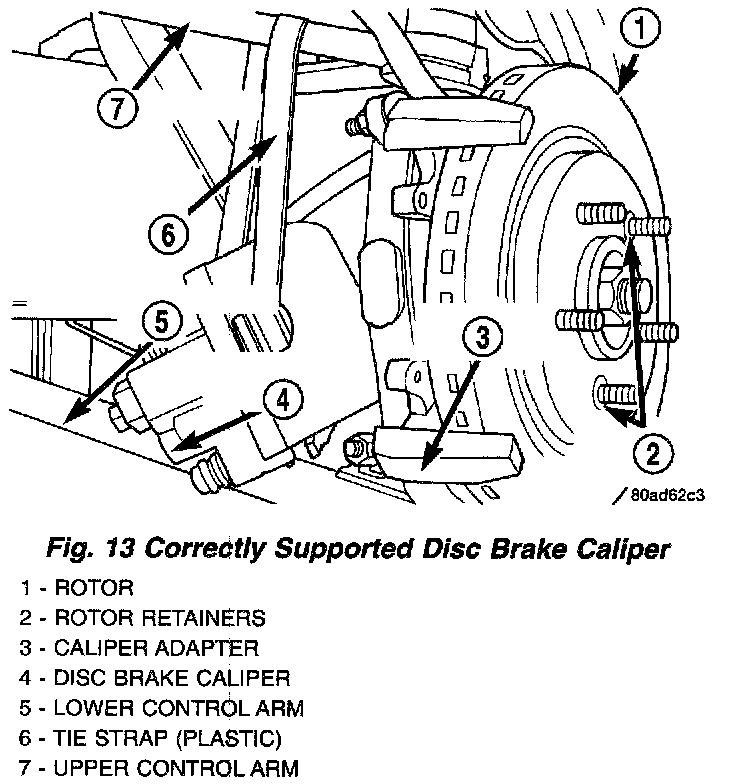 6. Support the disc brake caliper firmly by hanging it from the upper control arm using a tie strap. Do not let the flexible brake hose support the weight of the brake caliper as damage to the hose can occur.