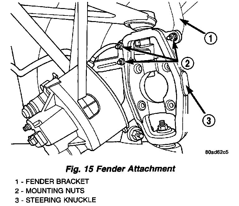 9. Remove the 3 nuts mounting the fender bracket to the steering knuckle. Remove the fender from the steering knuckle.