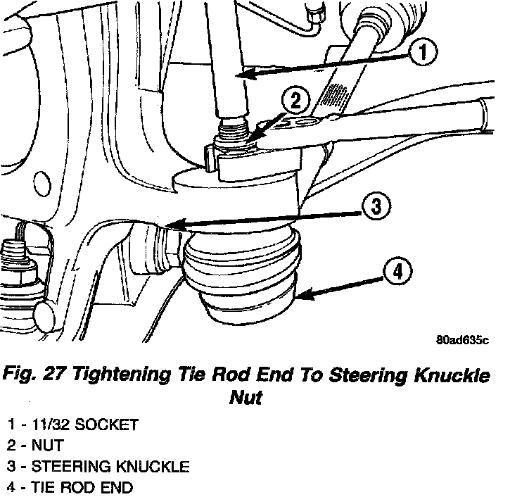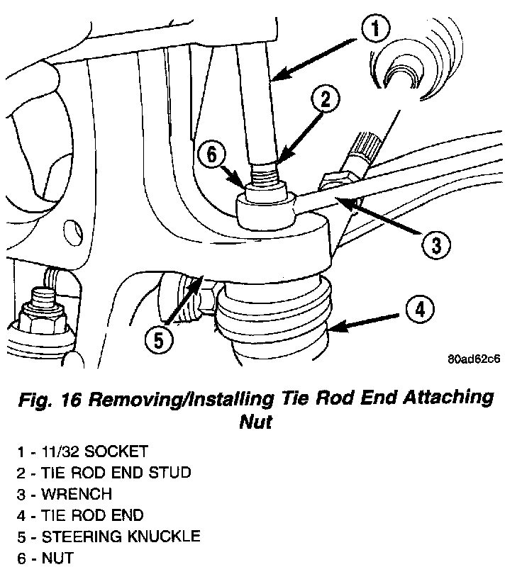 5. Install the outer tie rod to steering knuckle attaching nut and washer. Tighten the tie rod attaching nut to a torque of 52 Nm (38 ft. lbs.) using a crow foot and a socket on the stud.