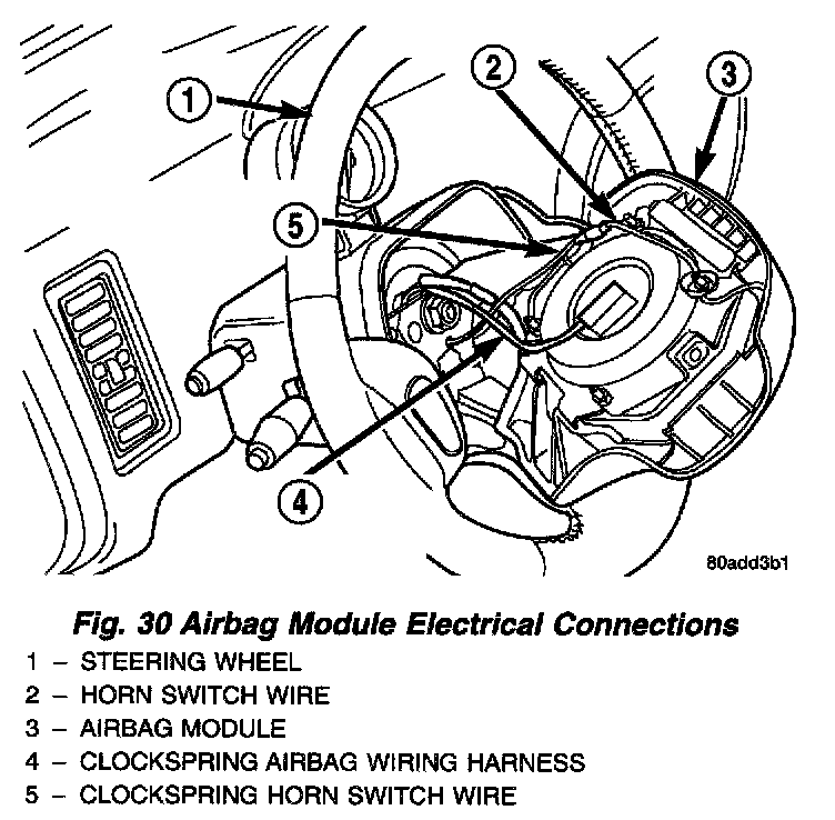 4. Disconnect airbag wiring harness connector from clockspring at airbag module. Then disconnect wiring lead for horn switch in airbag module from clockspring wiring lead.