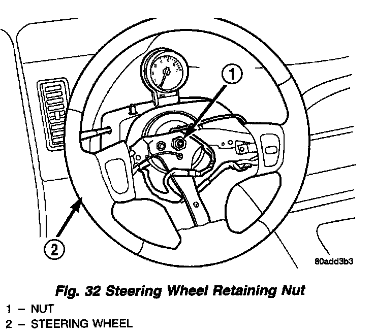 CAUTION: Do not install steering wheel onto shaft of steering column assembly by driving it onto the shaft. Push steering wheel down onto steering column shaft splices by hand, paying attention to the master spline, then draw it into place using the steering wheel retaining nut.