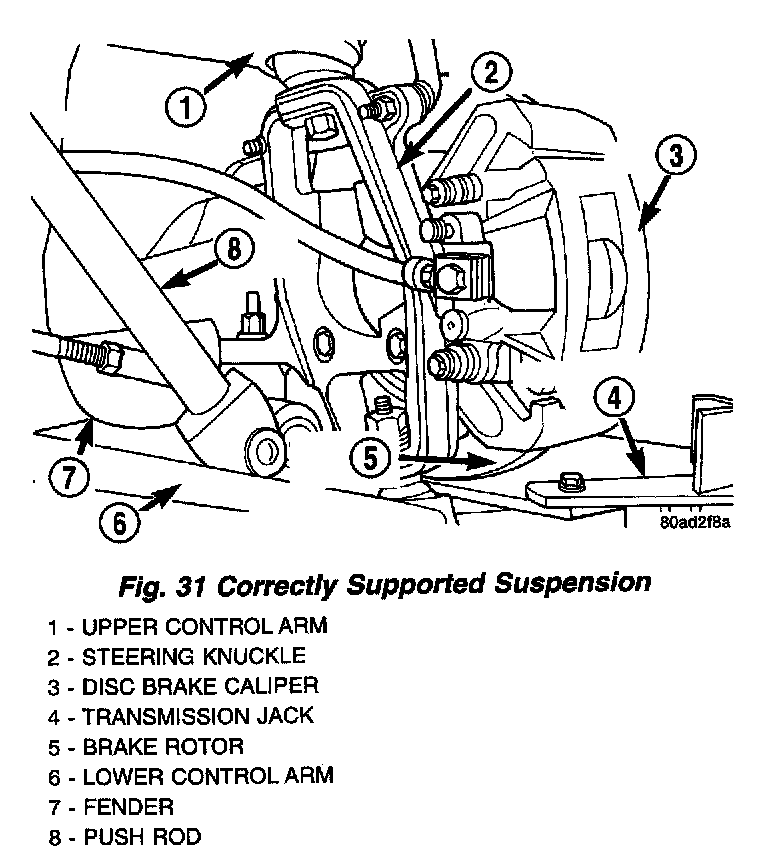 5. Support the suspension on the side of the vehicle that the lower control arm is to be removed from by placing a transmission jack under the brake rotor. Raise the transmission jack so it contacts the brake rotor only. Do not lift the suspension.