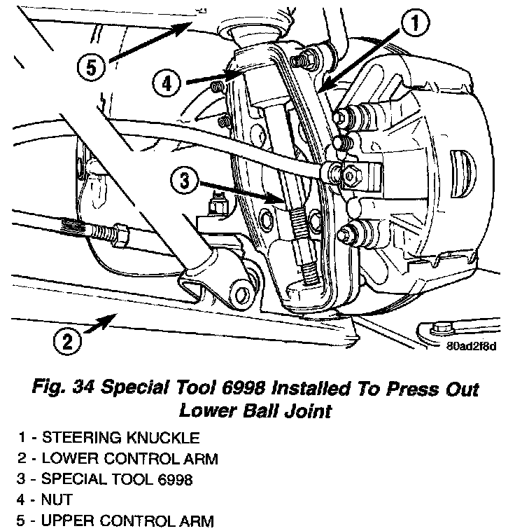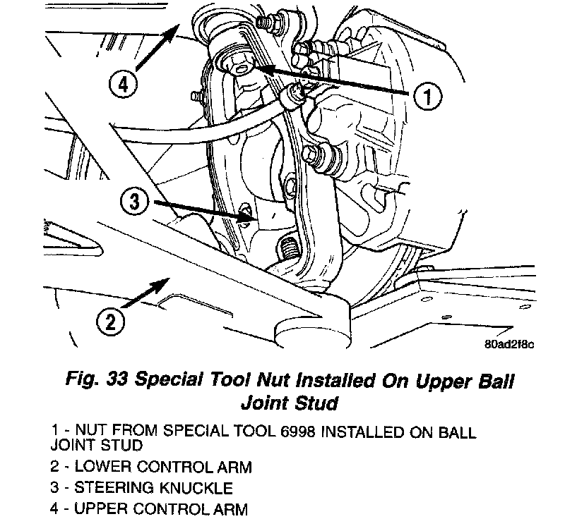 NOTE: The special nut must be installed on the stud or the upper ball joint to properly align the Remover, Special Tool 6998, with the stud of the lower ball joint. Use of the special nut will also prevent damage to the steering knuckle when pressing out the lower ball joint stud.