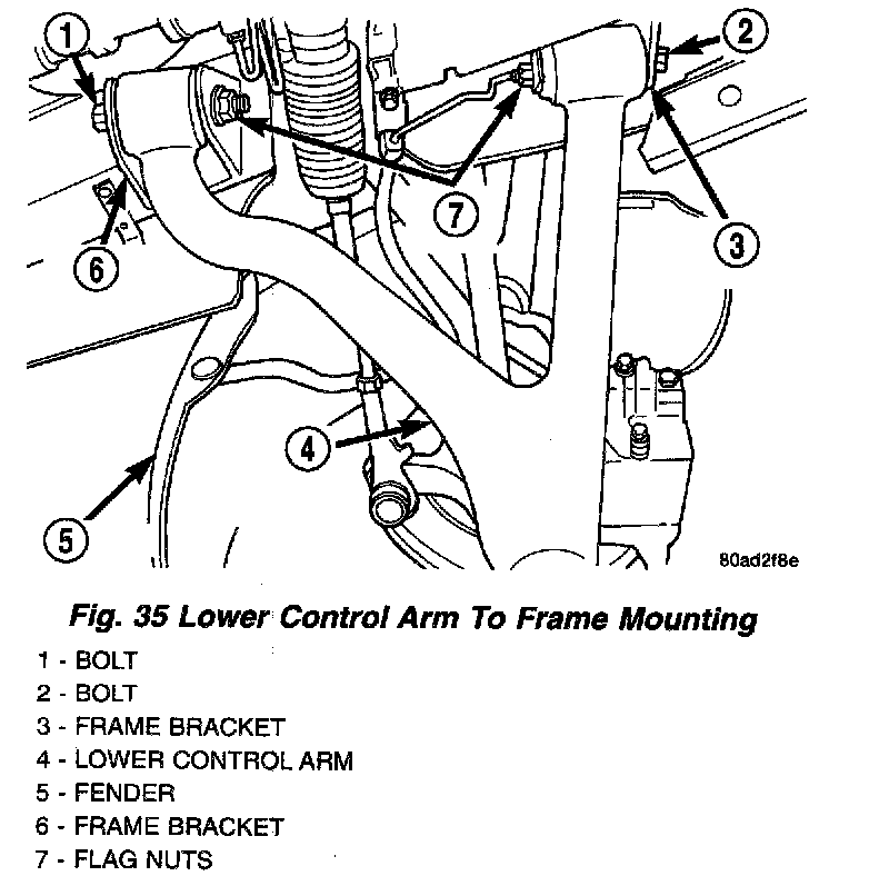 13. Remove the pivot bolts and flag nuts attaching the lower control arm to the frame brackets.