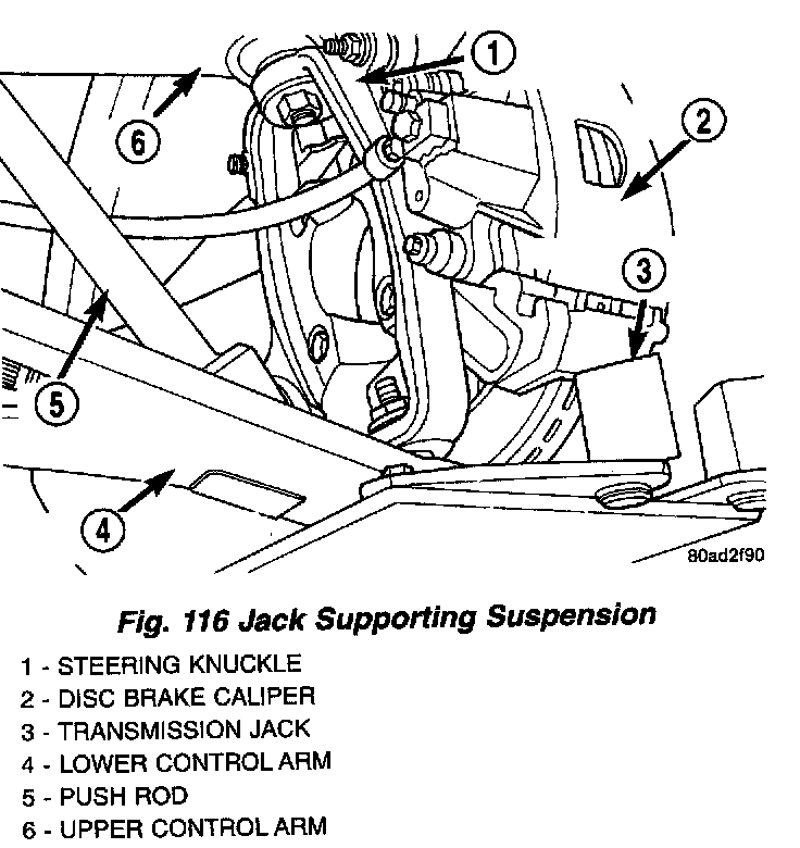 16. Place a transmission jack under the lower control arm. The transmission jack will support the suspension when the ball joint on the upper control arm is removed from the steering knuckle.