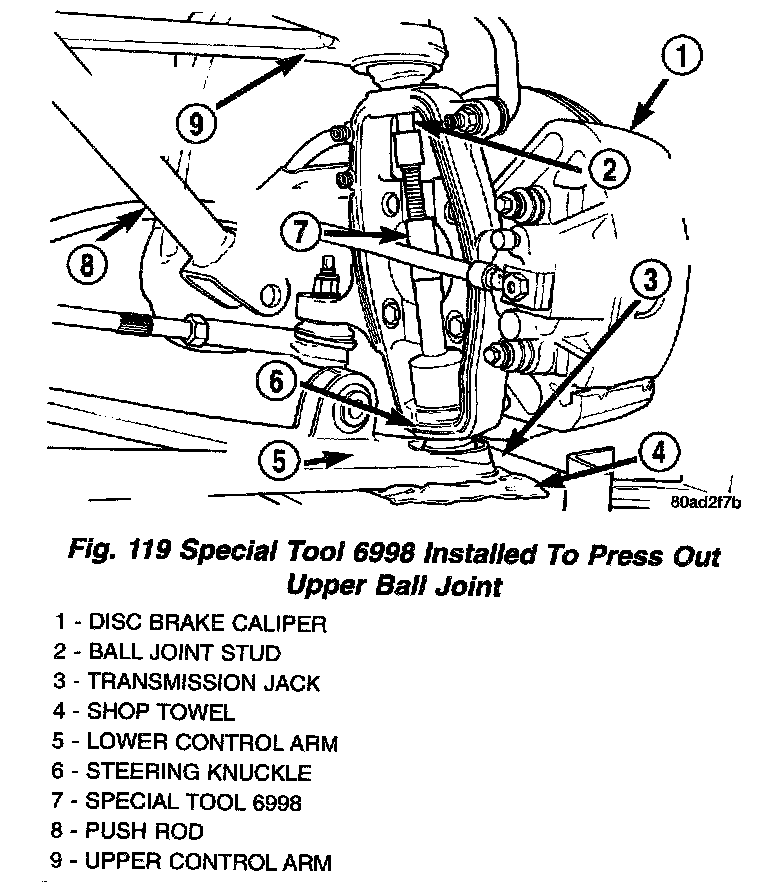 19. Place the threaded end of Remover, Special Tool 6998, against the stud of the upper control arm ball joint.