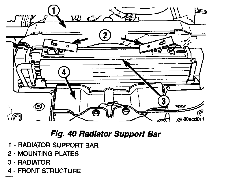 3. Remove the 4 bolts mounting the radiator upper support to the front structure of the vehicle. Remove the radiator upper support.