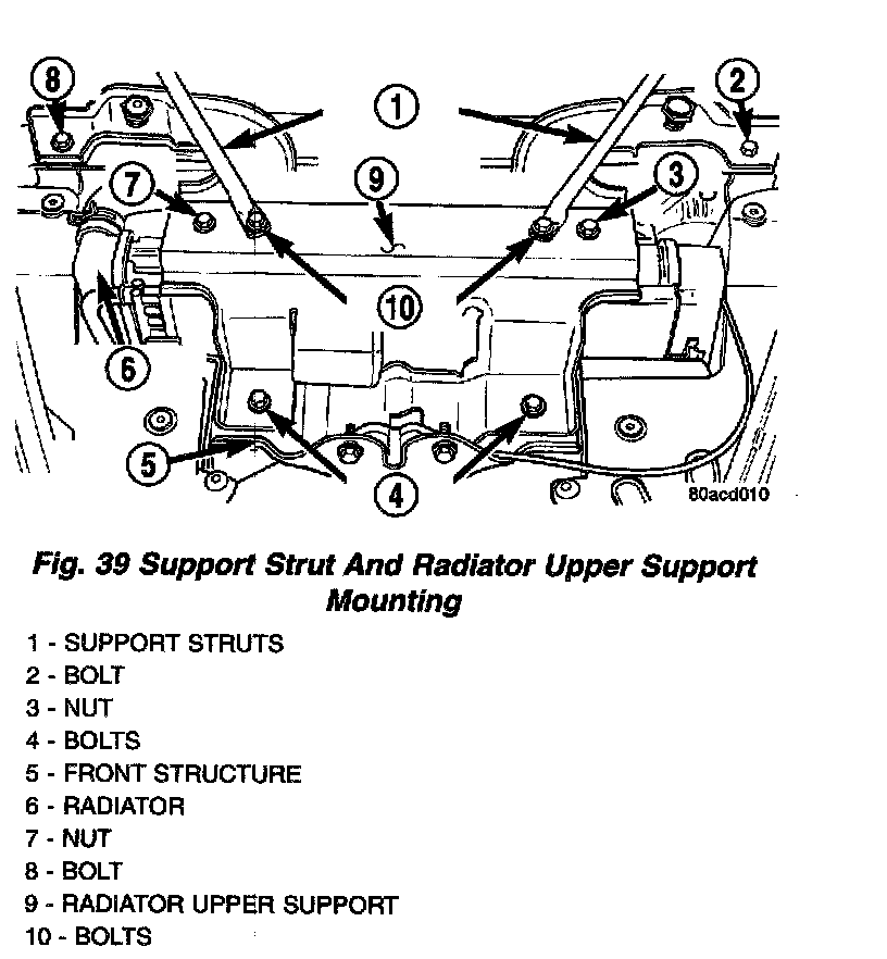 1. Remove the 2 bolts attaching the support struts to the radiator upper support. Move support struts away from the radiator upper support.