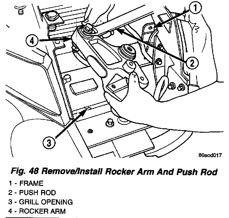18. Remove the rocker arm and push rod as an assembly from the vehicle through the grille opening in the front of the vehicle.