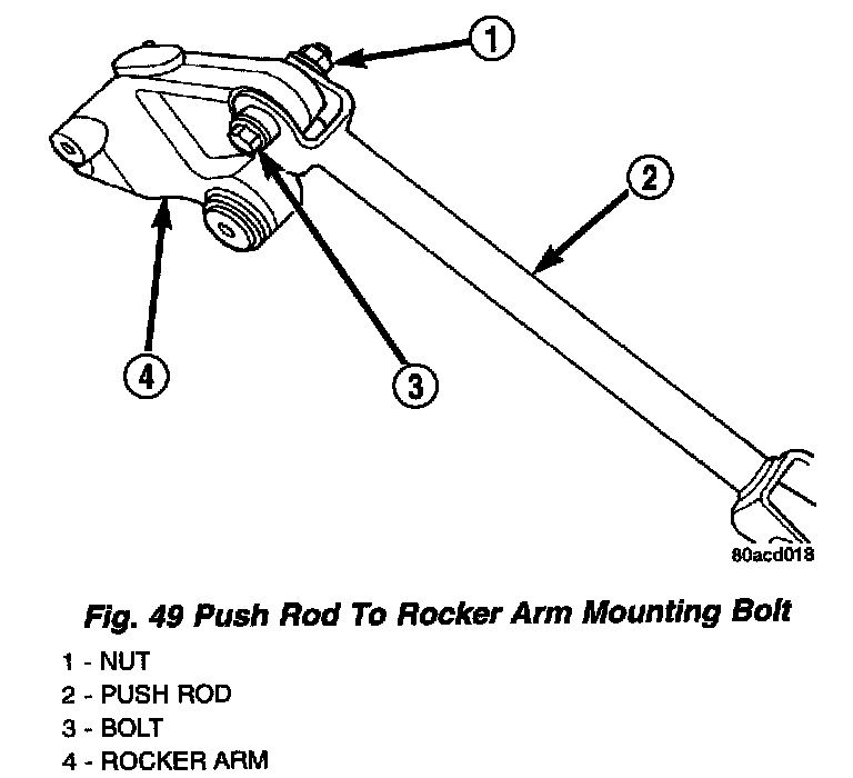 1. Install the push rod on the rocker arm. Install the push rod to rocker arm mounting bolt and nut in a way that the head of the bolt is toward the front of the vehicle once the assembly is installed in the vehicle.