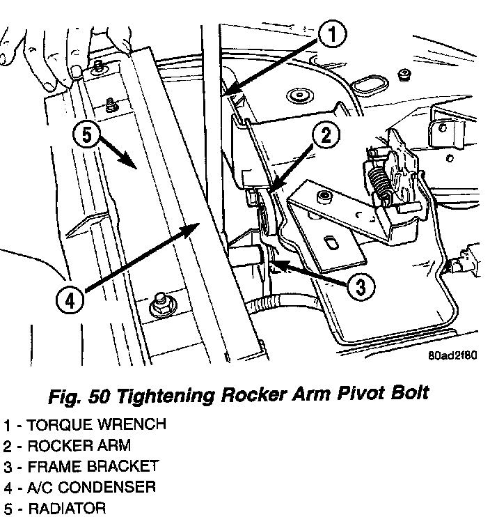 16. With the aid of a helper, move the radiator as far rearward while lifting it up as high as possible. This is required to gain enough room to remove the rocker arm mounting bolt.