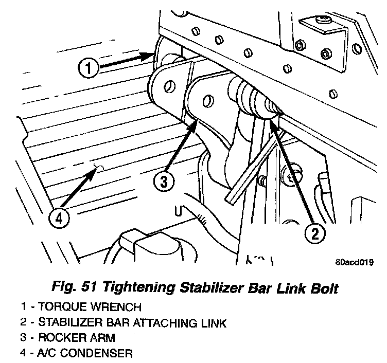 CAUTION: Access to the stabilizer bar link bolt and rocker arm mounting bolt for torquing is from the back side of the rocker arm, between the rocker arm and A/C condenser. Extreme care must be used to avoid damaging the AIC condenser.