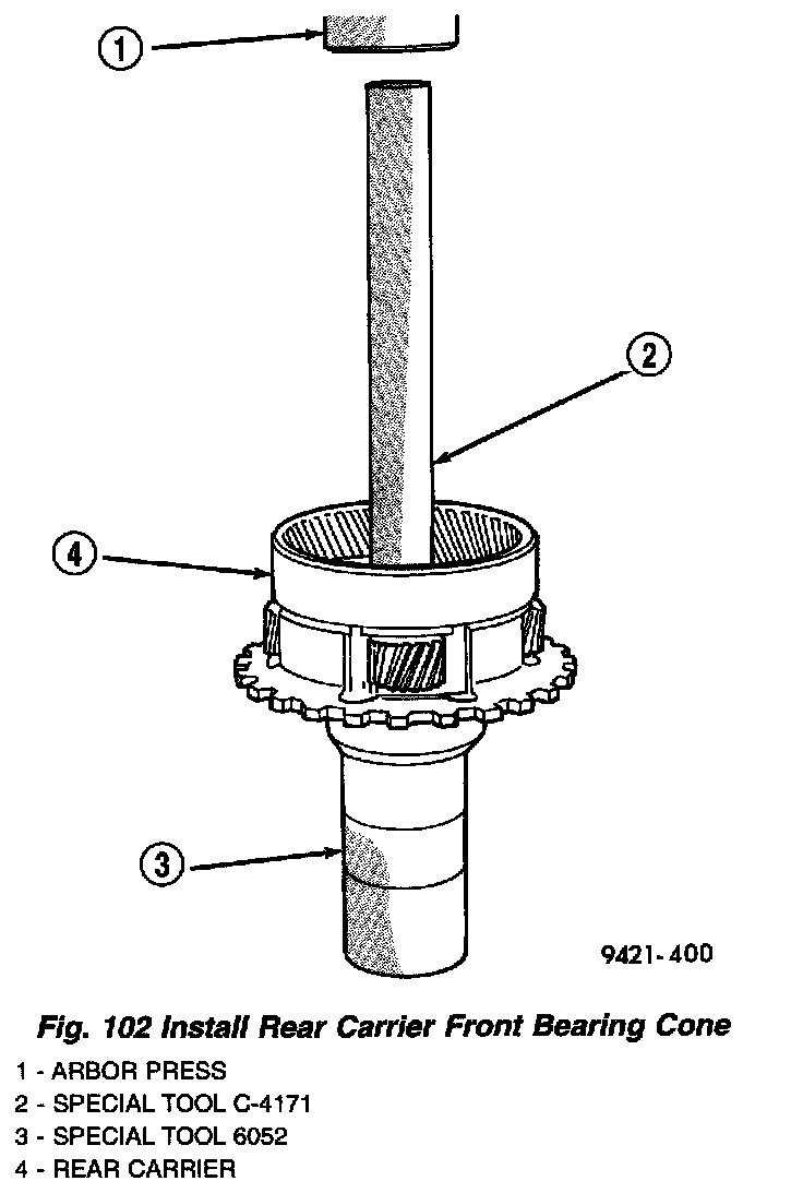 12. Install rear carrier front bearing cone (Fig. 102).