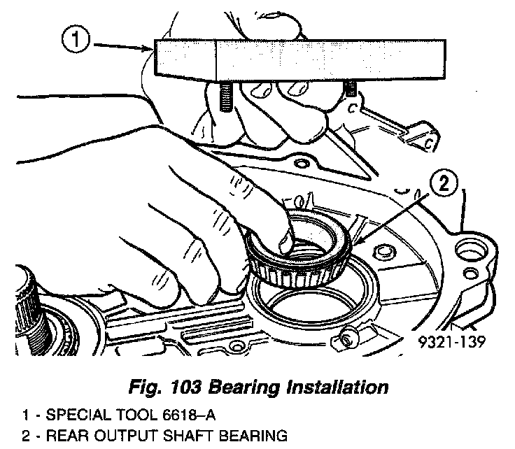 a. PRELOAD CHECK/SHIM SELECTION: Install rear output shaft bearing cone and special tool 6618A (Fig. 103).