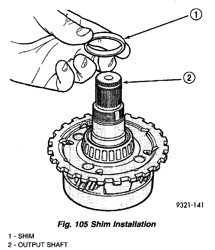 d. Install shim on output shaft (Fig. 105). Apply small amount of petrolatum onto the shim to hold it in place. Use the original shim as a starting point. If original shim is not available, use the thickest shim available. Refer to Output Shaft Rear Shim Chart for available sizes.