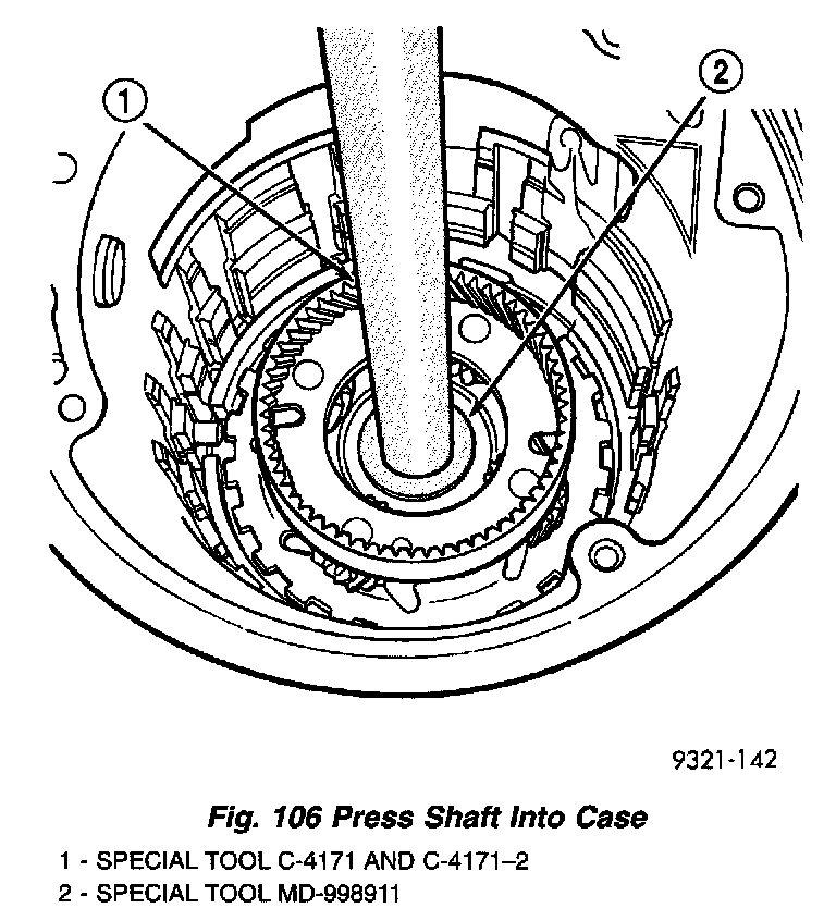 e. Install output shaft/rear carrier into rear bearing. The shaft must be pressed into position. Use special tool MD-998911 (Disc) and C-4171 and C4171-2 (Handle) to press shaft into rear bearing (Fig. 106).