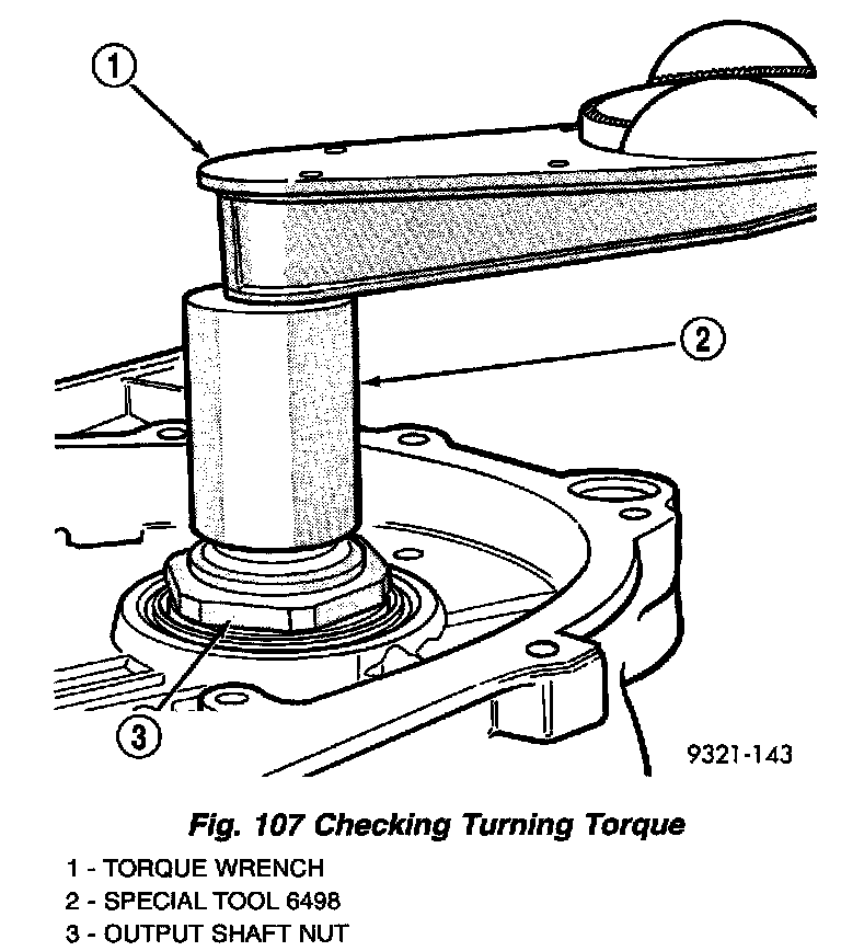 g. Check the turning torque of the output shaft (Fig. 107). The shaft should have 1 to 8 in. lbs. of turning torque. If the turning torque is higher than 8 in. lbs., install a thicker shim. If turning torque is less than 1 inch lb., install a thinner shim. Make sure there is no end play.
