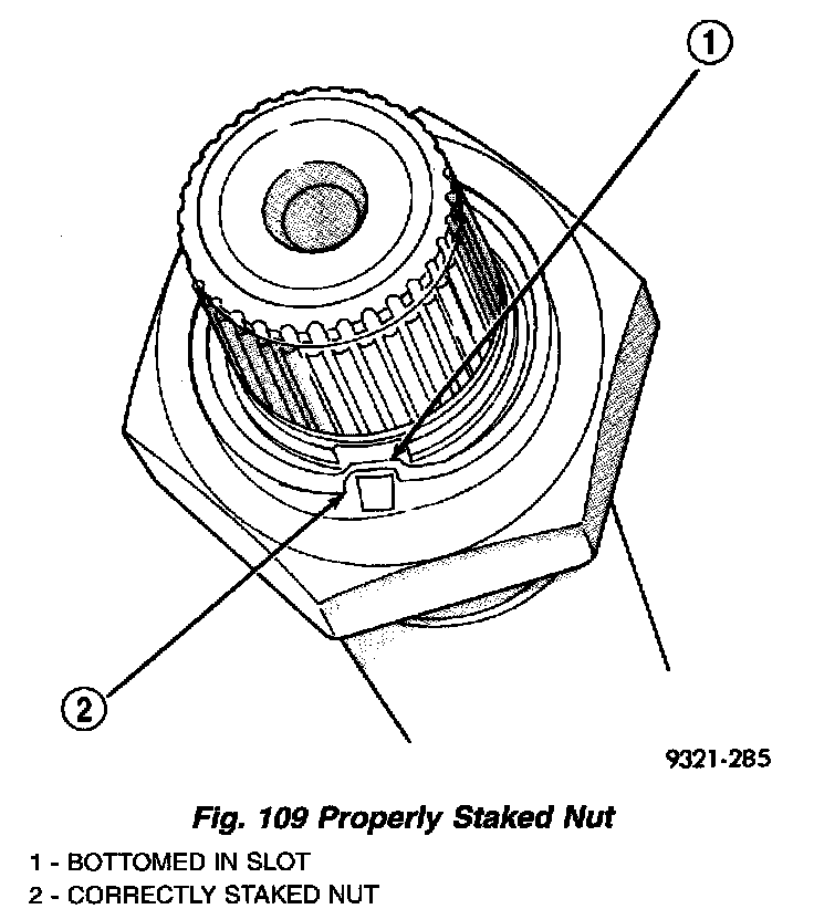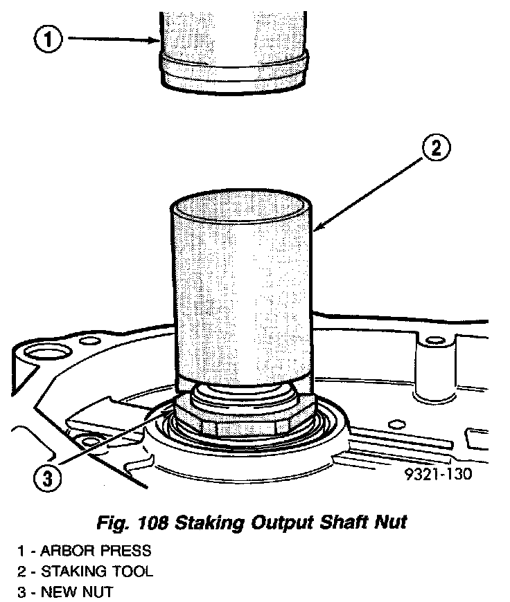 h. The new nut must be staked after the correct turning torque is obtained (Fig. 108) (Fig. 109). Use special tool 6639 to stake output shaft nut and special tool 6589 to stake transfer shaft.