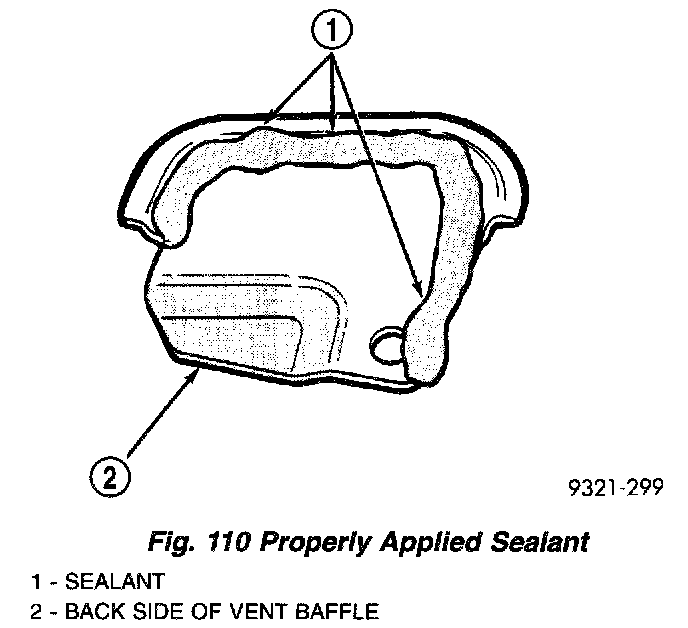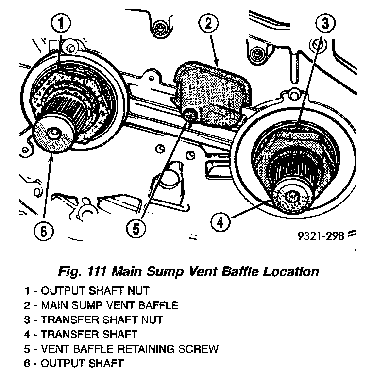 14. Apply Mopar Silicone Rubber Adhesive Sealant as shown in (Fig. 110). Install main sump baffle to transaxle case (Fig. 111) and torque screw to 5 Nm (45 in. lbs.).