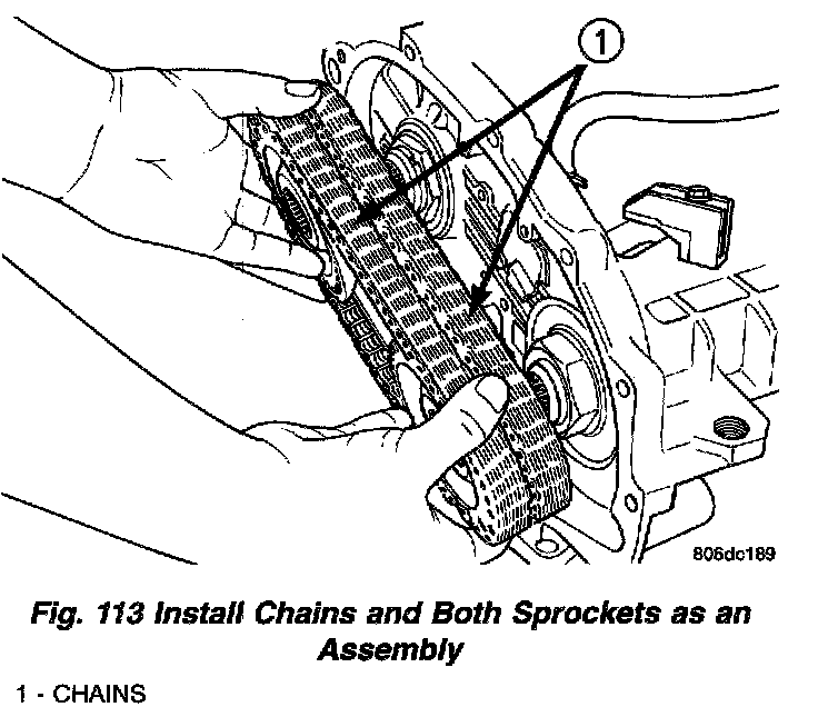 16. Install transfer chain and sprockets to transfer shaft and output shaft (Fig. 113).