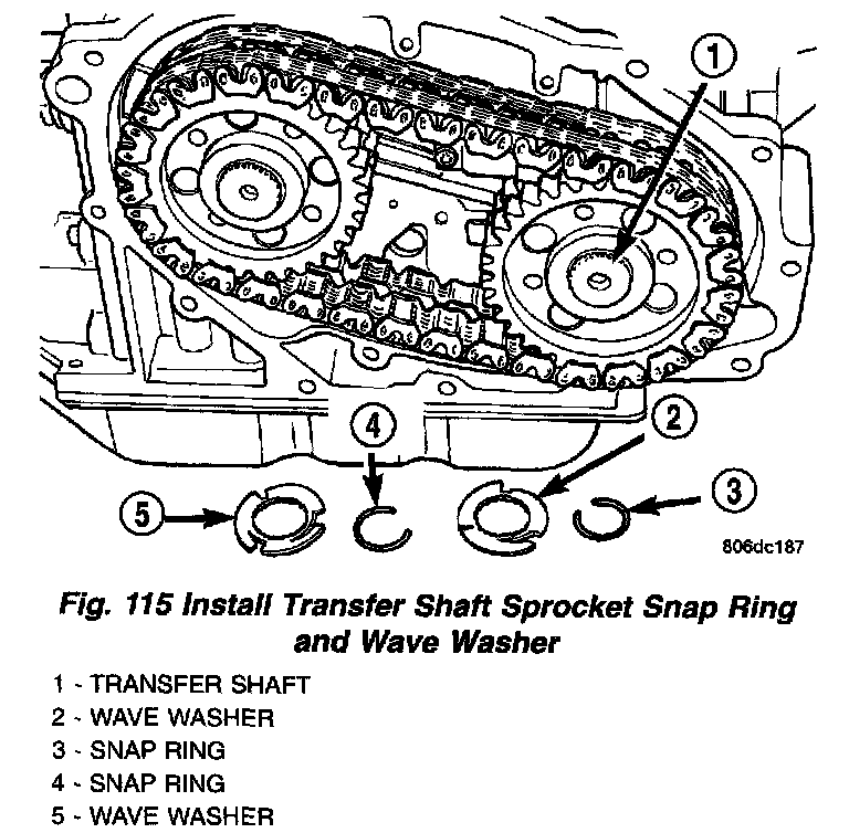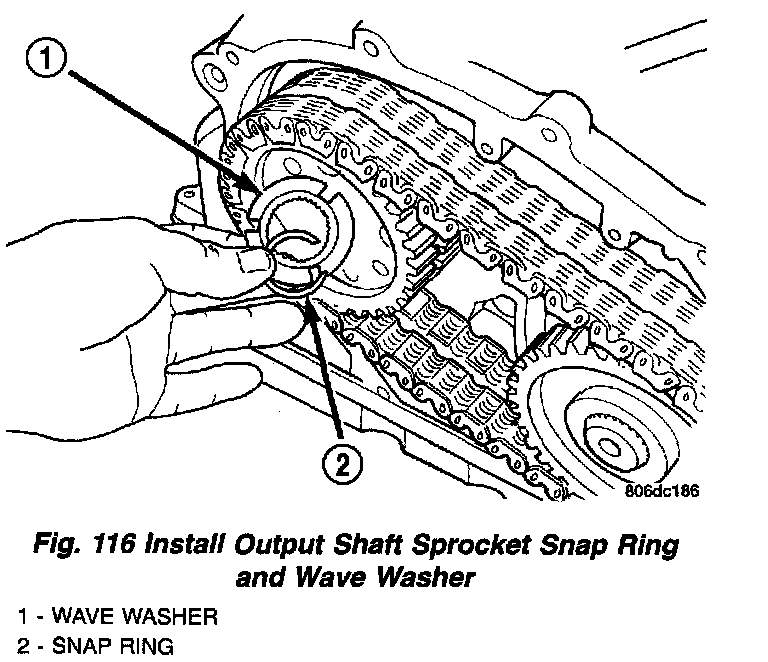 18. Install transfer shaft sprocket snap rings and wave washers (Fig. 115) (Fig. 116).
