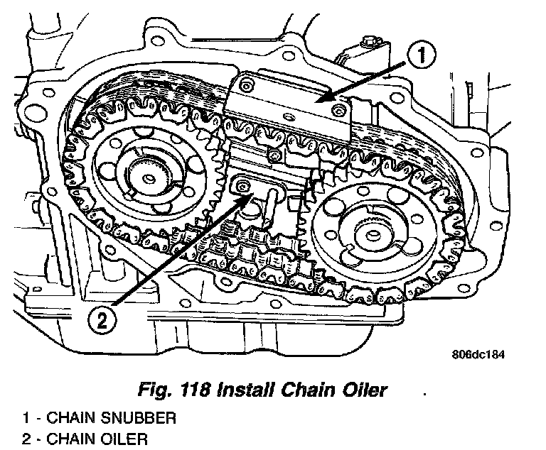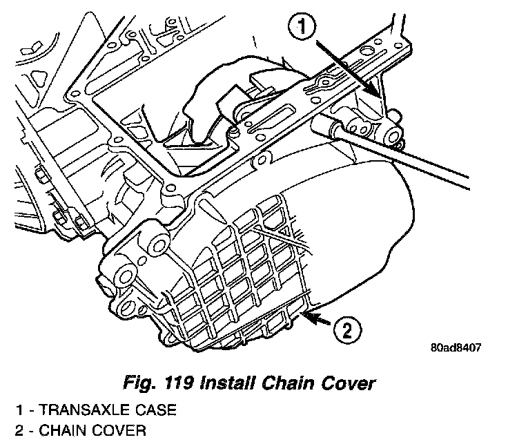 22. Install chain cover (Fig. 119). Chain cover must be free of old sealant, dirt and oil before applying new sealant. Apply a 1/8 inch bead of sealant to flange of cover.