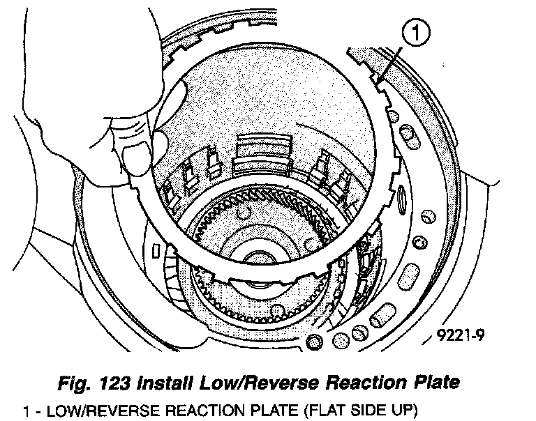 26. Install low/reverse reaction plate with flat side up (Fig. 123).