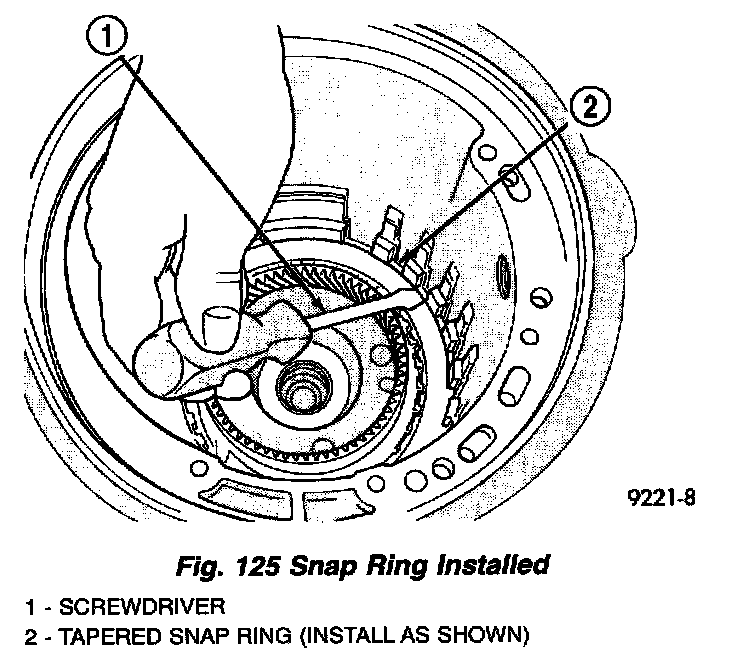 27. Install tapered snap ring (tapered side out) as shown in (Fig. 124) (Fig. 125).