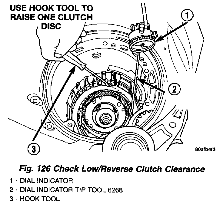 28. Measure low/reverse clutch pack. Set up dial indicator as shown in (Fig. 126). Press down clutch pack with finger and zero dial indicator. Low/Reverse clutch pack clearance is 0.86 to 1.52 (0.034 to 0.060 inch).
